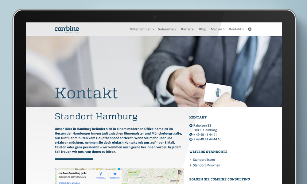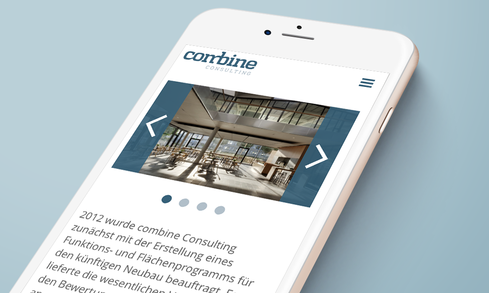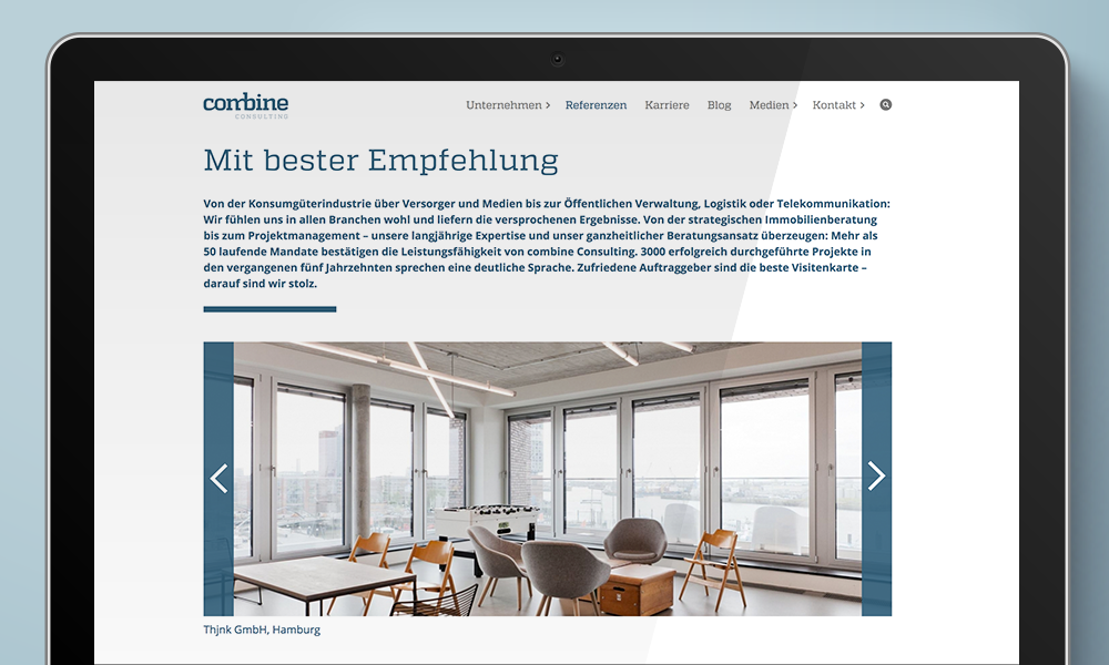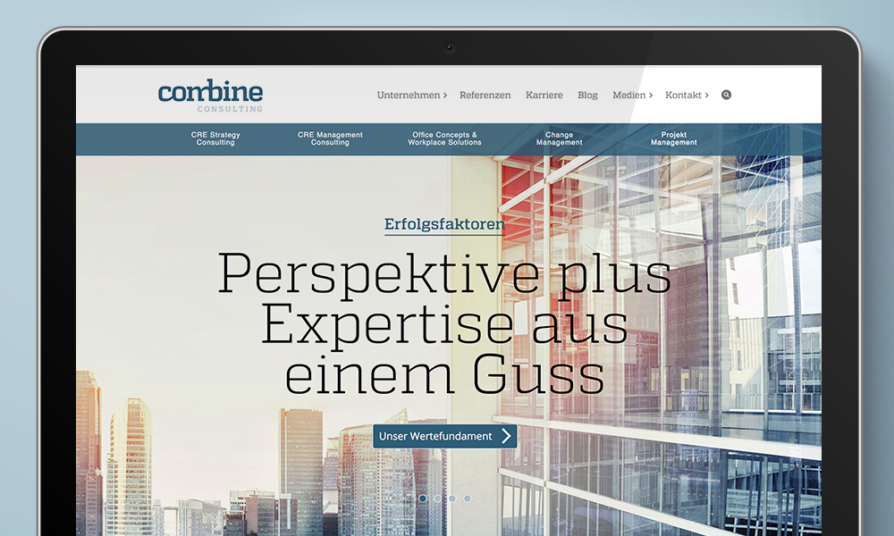 Strategischer Weitblick und Spezialwissen in der Immobilienwirtschaft: Dafür steht das Beratungsunternehmen combine. Ziel ist die optimale Wertschöpfung der Kunden bei der Planung und Nutzung von Immobilien. Wie die Dienstleistung funktioniert und wie umfassend das Know-how von combine ist, zeigt die informative und zeitgemäße Homepage. Mit einer intuitiven Navigation und Texten, die auf den Punkt kommen.