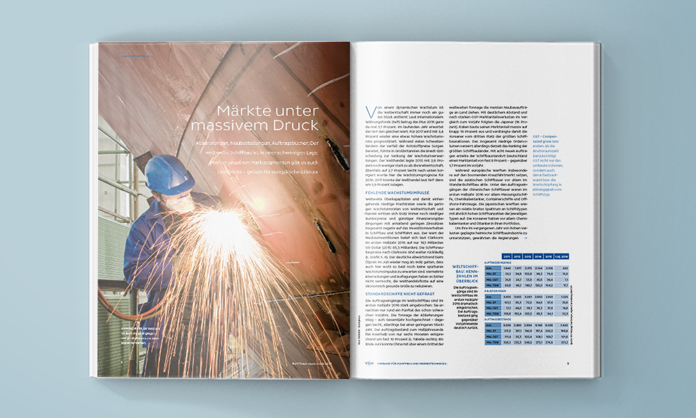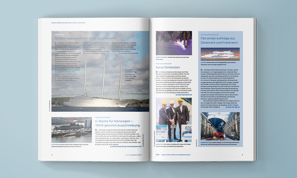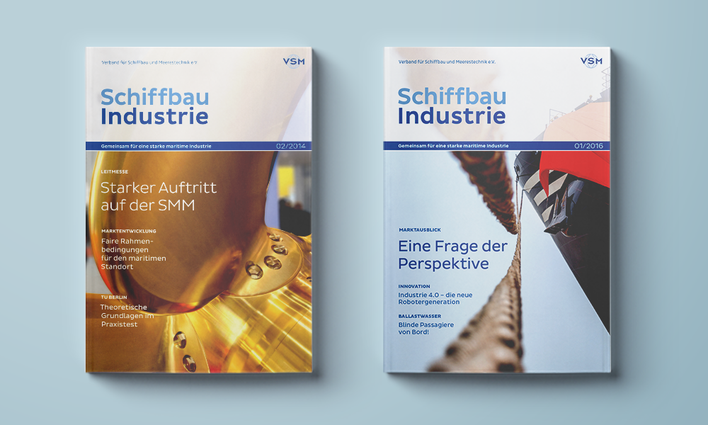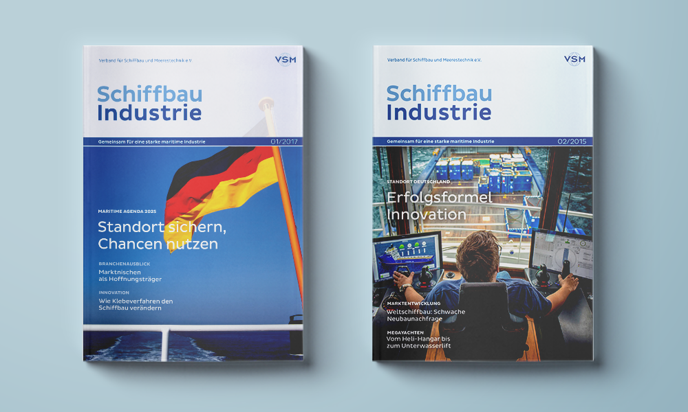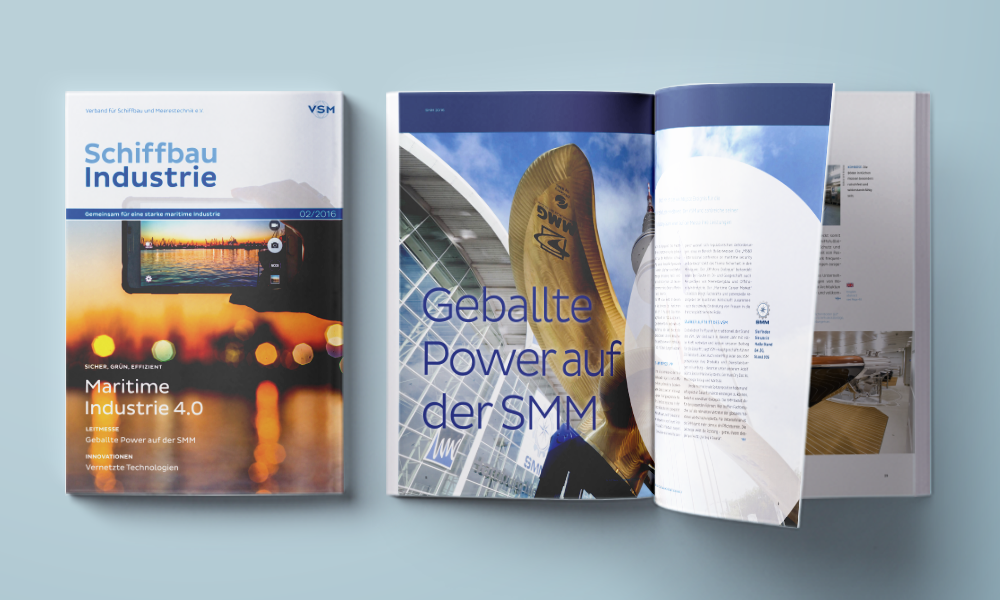 Das Magazin des Verbands für Schiffbau und Meerestechnik informiert seine Leser über die neuesten Trends und Entwicklungen in der Branche. Marktberichte, Portraits einzelner Mitgliedsunternehmen sowie die Vorstellung erfolgreicher Projekte runden das Portfolio ab. Die inhaltliche und grafische Überarbeitung hat die „Schiffbau Industrie“ auf ein neues Level gehoben.